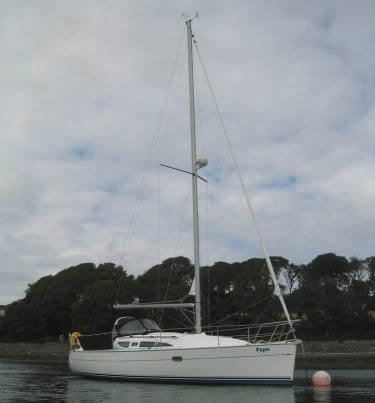 PepePepe is a very well equipped Jeanneau 32 which joined us in late 2011. She has a conventional two cabin layout which makes her ideal for family groups or up to five adults (six if one is small!), although we would recommend four as a sensible limit for charters of a week or more. On deck Pepe has an electric anchor windlass and a very large cockpit for a boat of her size. She has conventional roller furling genoa and in-mast reefing for the mainsail, whilst under power she is pushed along by a Volvo 20hp engine connected to a two bladed propeller. Steering is by wheel, and she has an autopilot at the helm as well as full instrumentation in the cockpit. Pepe has the popular two cabin layout complimented by a good sized heads and shower with hot water coming from both the engine and also shore-power when available. The galley is of a good size and lies to starboard; two burner cooker and oven accompanied by a good sized fridge. Immediately forward of the galley is the chart table area where both radar and chartplotter (independent systems) are located. Like all or boats she comes equipped with a tender and outboard, and is fully coded to MCA requirements. This means that she has a full compliment of safety equipment on board, including lifejackets and harnesses, liferaft, flares and first aid kits, as well as a range of automatic and manual fire extinguishers. She is also equipped with a large folio of Admiralty charts, pilots and almanac, together with an on-board manual and supporting literature, and warm air heating for the main domestic cabins.